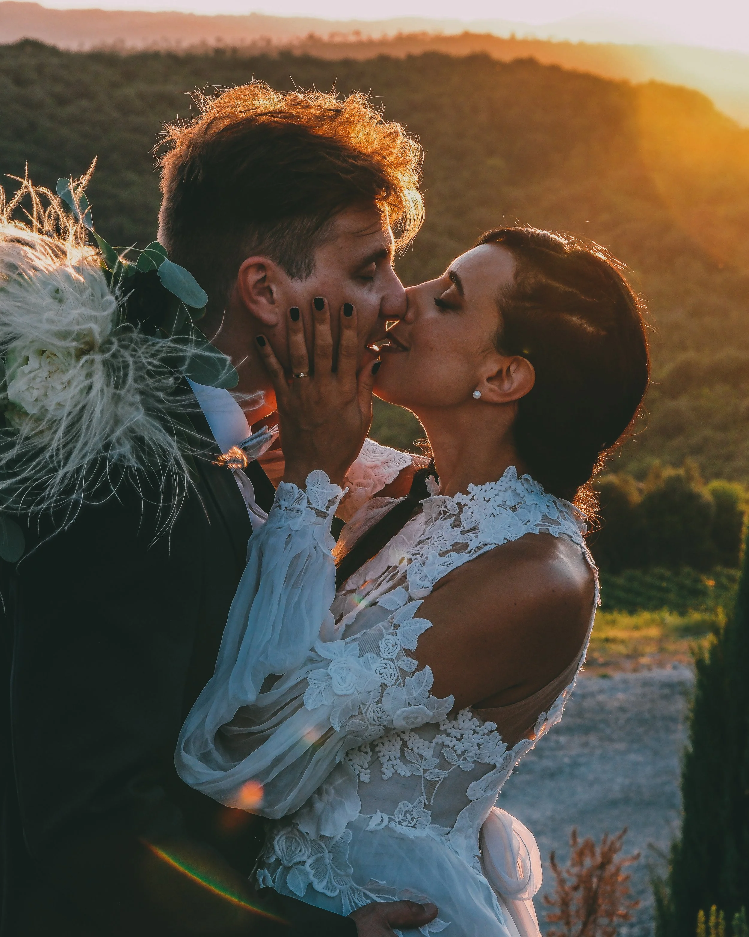 Una luce pazzesca, calda come un abbraccio, ha iniziato a colare tra i colli, accendendo i profili dei cipressi e trasformando ogni brindisi in un riflesso d'oro. In quel momento, mentre il sole si tuffava dietro l'orizzonte, non c'era bisogno di pose o di indicazioni. La felicità di Ilaria e Federico era lì, cruda e bellissima: nei loro sguardi complici, nei sorrisi larghi di chi sa di essere esattamente dove voleva essere.